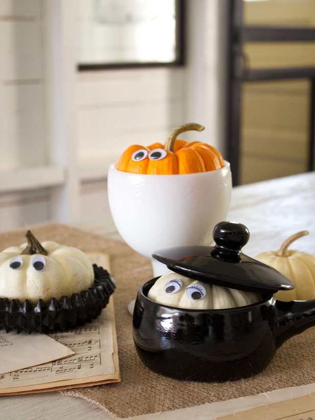 Pull together a grouping of small, inexpensive bowls or lidded dishes. Apply craft glue to the back of a pair of googly eyes, then attach one set of googly eyes to each pumpkin. Tip: Place the pumpkins in the dishes before you attach the eyes so you can make sure they’re positioned correctly.