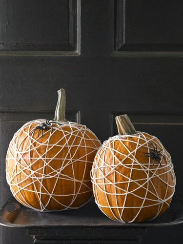 Simply wrap in random patterns your pumpkin with white twine and glue plastic spiders in place.