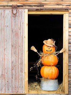 Stack 3 pumpkins and secure using a dowel rod or hot glue. Put 2 brooms into the pumpkin on either side for the arms (you can use a drill bit to make the holes), wrap some grapevine or bittersweet garland around the neck and top him off with a straw hat, either adorned or plain. To make him taller you can perch him on a bucket or urn depending on your taste.