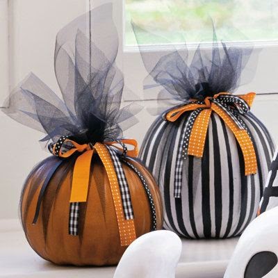 Using Halloween colored or styled tulle and ribbon, simply wrap your pumpkin leaving enough to be taller than the stem. Then simply tie ribbon around the stem to secure the tulle in place.