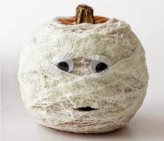 Grab the gauze for this fun little guy. Simply use spray adhesive, spraying the entire pumpkin. Start at the bottom and begin wrapping him up. Leave a spot to place the eyes or wiggle (no pun intended) them into place, using hot glue to secure them. You can insert a piece of black felt for the mouth, or leave it as is.