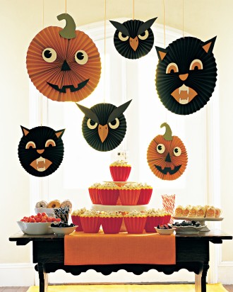 Halloween Hang-Ups ~ You will need: Pumpkin template, Owl template, Cat template, 8 1/2-by-11-inch sheets of colored paper, Glue stick, Hot glue gun, Hole punch, and Ribbon. Instructions: 1. For each decoration, you’ll need to accordion-fold 8 1/2-by-11-inch sheets of colored paper, making 1/2- or 3/4-inch folds. For small faces, accordion-fold 3 sheets of paper vertically, then bend each in half to make a fan. For medium, accordion-fold 6 sheets horizontally. For large, accordion-fold 11 sheets vertically. 2. For small faces, cut 6 strips of paper equal to length of fan’s fold and twice its width; fold in half lengthwise. Use a glue stick to attach strips to fans, and fans to one another, forming a circle. For larger faces, glue 1 edge of folded paper to next until you form a circle. Hot-glue center to secure. 3. Print templates (pumpkin, cat, and owl, above), enlarging or reducing to desired size. Trace shapes onto colored paper twice; cut out. Attach shapes to each side of decoration with hot glue. Hole-punch top; hang using ribbon.