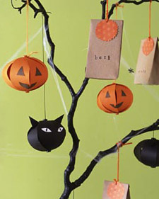Bewitching Tree Decoration ~ Scare up fun at a Halloween party with a centerpiece that displays favor bags and seasonal ornaments. Branches hold candy-filled bags for guests to bring back to their lairs. For the tree, spray paint a branch black ~ Wedge into a flower bucket filled with rocks. Cover with Spanish moss, and stretch craft-store cobwebs between branches. For the ornaments and favors ~For each ornament, trace a template onto construction paper seven times. Cut out. Stack pieces, and punch holes through both ends with a small hole punch; insert a black or orange paper fastener into each hole. Bend stack into a C shape; fan out pieces to form a globe. Glue on paper features (for cat’s ears, fold bottom under to make a tab). For favors, stamp mini paper bags with names. Using pinking shears, cut traced circles out of paper. Fill bags; fold over tops. Place a circle on each; punch a hole through all layers. Tie on yarn for hanging.