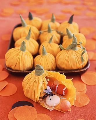 Pumpkin Favor Pouches for Halloween ~ For party favors or treats on Halloween night, fill crepe-paper pumpkin pouches with tiny toys and candy.