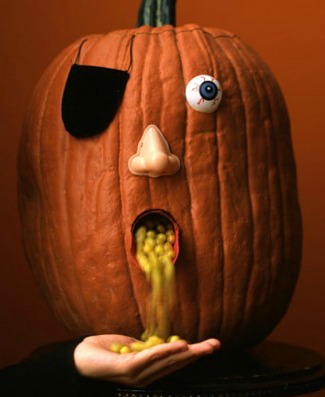 Creepy Candy Containers ~ It’s Halloween, and patches are full of pumpkins just waiting to provide spine-tingling thrills on the big fright night. Carving them into jack-o’-lanterns is always fun, but transform a few into candy holders with looks that could chill, and they can play a crucial role as keepers of the goodies.