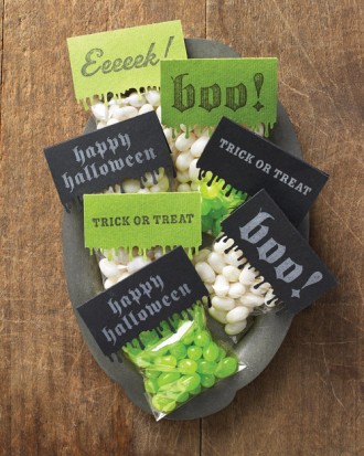 Creepy Custom Favor Bags ~ You will need: Cellophane bags, Heavyweight paper or card stock, Craft edge punch, Halloween rubber stamps, Ink pad, Double-sided tape, and Candy. Instructions: 1.Cut heavyweight paper or card stock slightly wider than your cellophane bags. Clip one edge with a craft edge punch. 2. Fold label in half; stamp with a Halloween message. 3. Fill cellophane bag with candy. Fold the bag’s edge down once to close, and secure the label on both sides with double-sided tape.