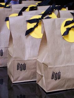 Treat Bags ~ Make 2 hole punches (here they added 2 bats so you would make 4 holes), thread the ribbon though, and tie in a knot (the knot will be the body).