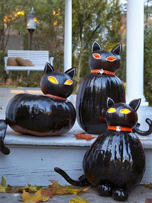 The Dazzling ~ Creating a trio of crystal-accented cats is so simple, it’s frightening. Pick large pumpkins for the bodies, smaller ones for the heads (snap off stems; turn upside down), and squash for the tails. Spray on a couple of coats of glossy black paint, and carve almond-shaped eyes. Cut triangle ears and collars from felt; affix with straight pins. With a hot-glue gun, attach plastic gems and rhinestone strips for purrfectly gloomy glamour.