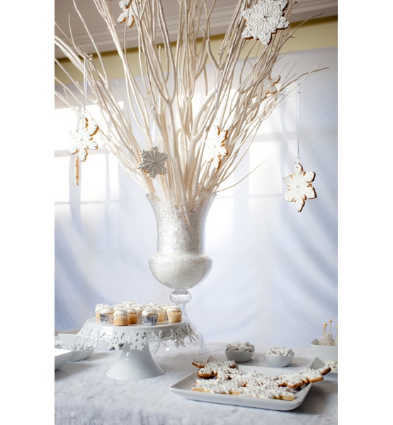 Hanging In ~ To create this look, use white branches and make iced cookies to hang from the branches with thin white ribbon.