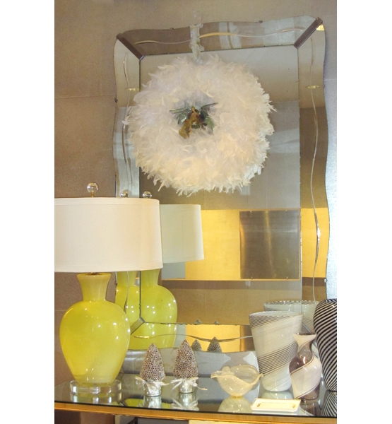 Flight of Fancy ~ Add holiday decor that enhances interiors rather than competes with them, add festive white feather wreaths to windows and doors to evoke a feeling of old glamour. As shown here, the white lampshade and wintry hues in the vases blend seamlessly with the wreath.