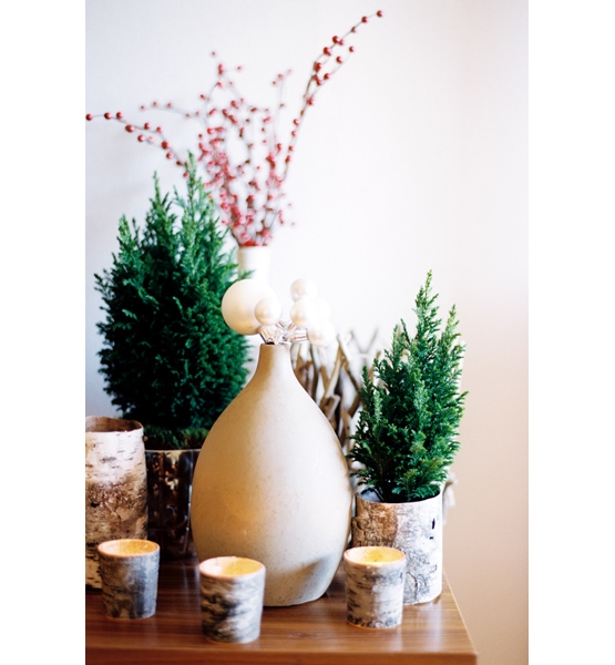 Super Natural ~ To turn an ordinary TV console into a beautiful holiday display, use birch planters and silver ceramic vases filled with metallic ornaments, faux red berries and living mini cedar trees.