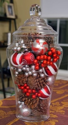 Seasonal centerpiece ~ An apothecary jar can be filled with bits and pieces like ornaments, beads and pine cones to create a seasonal centerpiece.