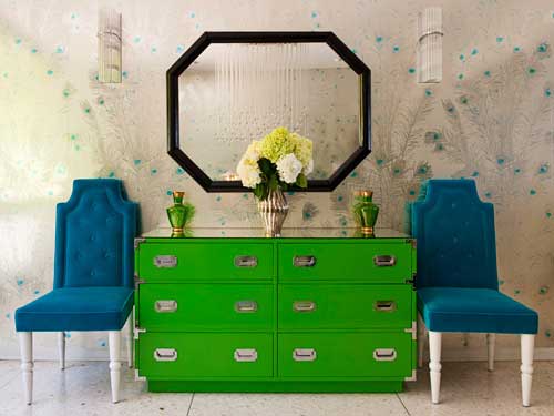 *Use dining chairs anywhere. These chairs started out with brown fabric and legs then were re-covered in blue velvet, with painted legs in white, and used to flank the dresser. Pairs are great for that.