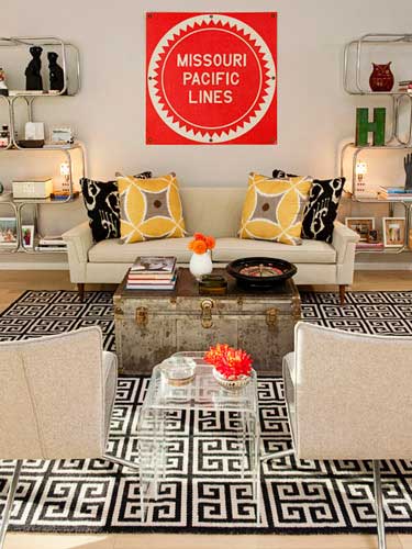*Don’t forget the extras. Keep ’em quirky and inexpensive. Look at a yard sales for things like the roulette wheel (it can be a great conversation piece), fun animal accents (hence the ceramic owl and the pair of black Foo dogs)
