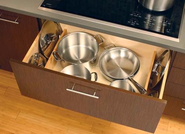 New Kitchen Storage ~ A cluttered kitchen can disrupt a cook’s workflow. Take control of disorganized pots and pans and disorderly drawers by buying or DIYing new solutions like a metallic knife rack or a pull-out pot holder.
