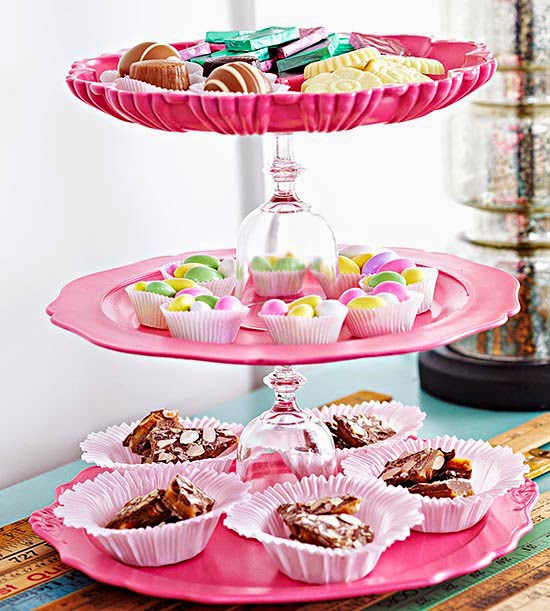 Combine interesting plates and glassware from a secondhand store or flea market to form a tiered serving platter. Prime, paint, and seal the plates with polyurethane. When dry, use glass adhesive to secure the bottom of a glass goblet to the underside of a dish. Repeat with a second goblet and dish. When dry, stack the pieces on a third plate. Since the paint isn’t food-safe, use paper between food and dish surfaces.