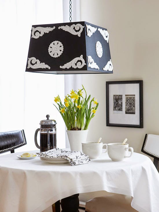 A simple cheap lampshade gets big style with spray painted wooden appliques from the crafts store. Attach the appliques with hot glue and hang the shade with a pendant light kit for a quick and easy way to add flair to the eating area in your kitchen.