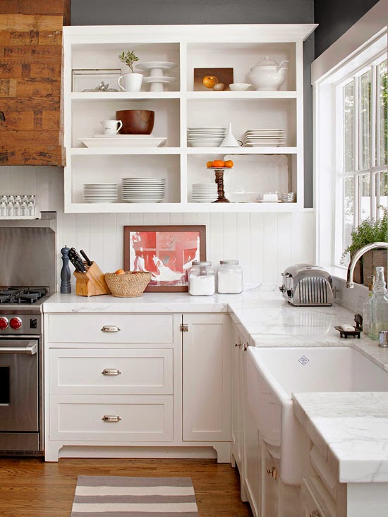Sometimes decorating is just as much about subtraction as it is addition. Examine the inside of your cabinet boxes to determine if they are display-worthy. The insides may need a fresh coat of paint or just a good cleaning. Remove doors and fill any holes with putty and paint or stain to match the cabinet box. Display favorite dishes, utensils, and cookware or large jars filled with pantry staples, such as flour, pasta, and rice, inside the newly exposed cabinet.