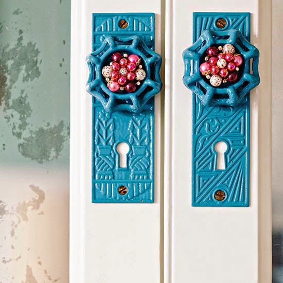 For a truly unique look, the handles on kitchen cabinets can be made using doorknob backplates and water spigot handles. Vintage clip-on earrings were detached from the clip and secured with metal glue to top off the look.