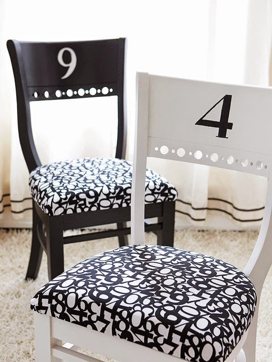 Coordinate mismatched secondhand chairs with paint and fabric. Sand, prime, and paint the chairs, then add a number to the chair back using a stencil and contrasting paint. Finish the transformation by covering the seat in a printed fabric — here, we used a numbered fabric to continue the theme.