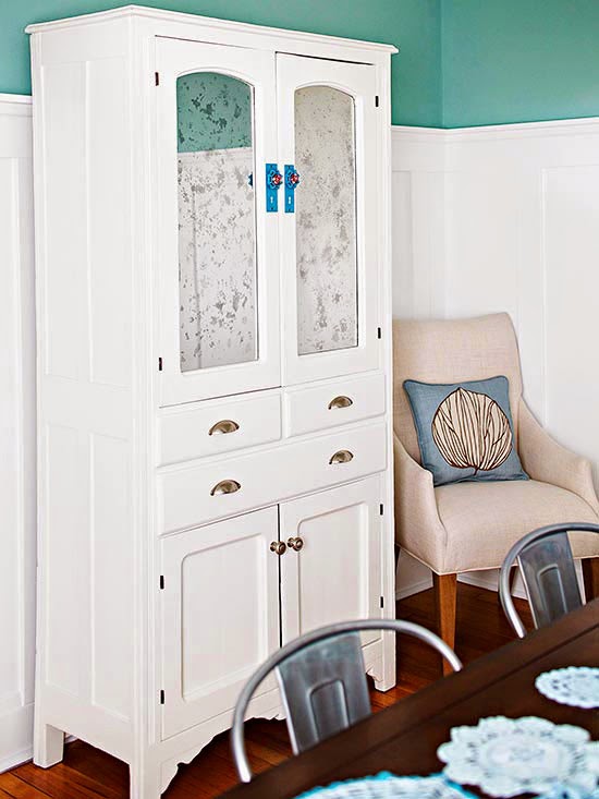 Stand-alone pieces of furniture are a great way to add additional storage to your kitchen. A fresh coat of paint and snazzy new hardware breathe new life into this old china cabinet. The blotched surface of the mirrored glass — created using a mixture of 1:1 water and vinegar — hints at the piece’s age.