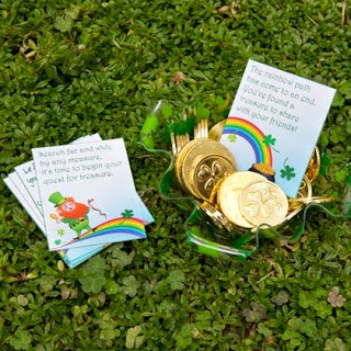 Hide some gold coins of your own, fill out the cards with clues, and send kids off on a fun treasure hunt! Suggested clues: Search far and wide by any measure, it’s time to begin your quest for treasure. The rainbow path has come to an end. You’ve found a treasure to share with your friends. Left and right you’ll turn your head, when you look underneath your bed.