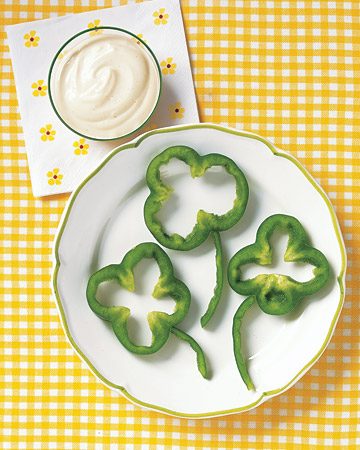 Dress up any St. Patrick’s Day meal by adding shamrocks made of green peppers to your plate. Slice a green bell pepper width wise; it will reveal a shamrock or lucky four-leaf clover shape. Slice another pepper lengthwise to create stems. You can also present it to kids as a lucky snack ~ just serve with your child’s favorite dip.