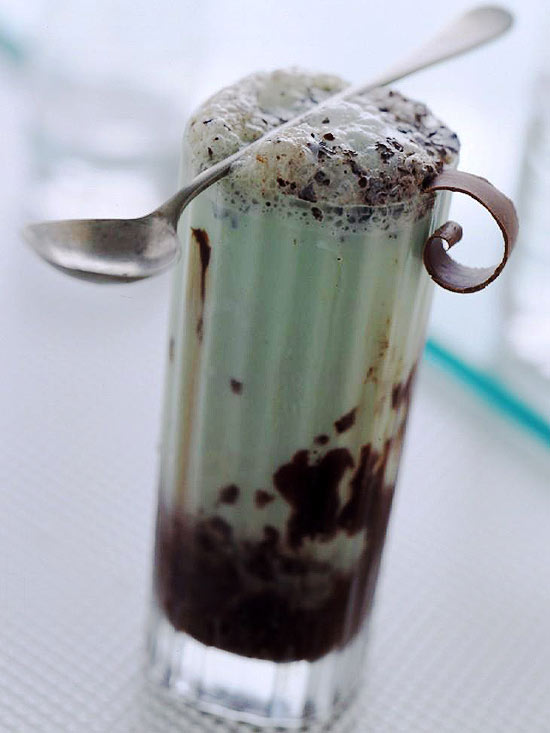 Pour 1 teaspoon of the chocolate syrup, then 1 teaspoon of the liqueur into each of four tall glasses. Add 2 scoops (1/2 cup) of mint-chocolate chip ice cream to each glass. Add 2 more teaspoons of chocolate syrup to each glass. Slowly pour 1/2 cup carbonated water or cream soda into each glass for fizz. Makes 4 servings.