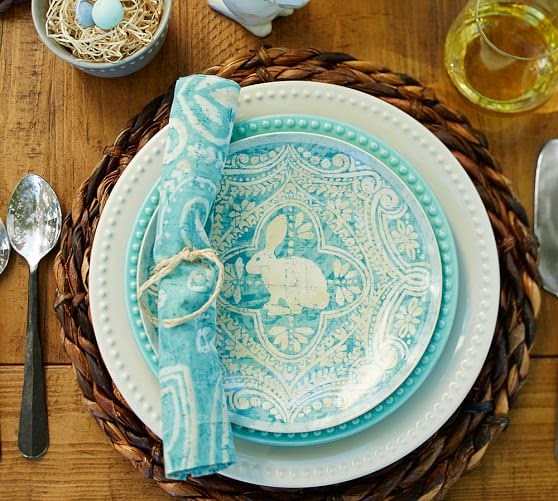 Italian-style glazing and baroque graphics give this bunny royal treatment in Easter plates designed by our own Pottery Barn studio artists. $42