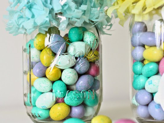 Do like Nest of Posies and fill a mason jar with chocolate eggs, or small toys and candy. Add some fun trim and enjoy.
