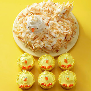 Get into the spirit of spring with a mother hen cake and her adorable cupcake chicks. Make a single layer cake for the hen, then use cupcakes to make her head and tail. Decorate with homemade vanilla frosting, toasted coconut flakes, and candy pieces for a truly delightful dessert.