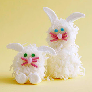 Frost a marshmallow with purchased frosting, then roll it in flaked coconut. Attach two miniature marshmallows for the feet and decorate with candies for the eyes, nose, and whiskers. For ears, use kitchen shears to cut a strip from the top edge of a large marshmallow, then attach with a bit of frosting.