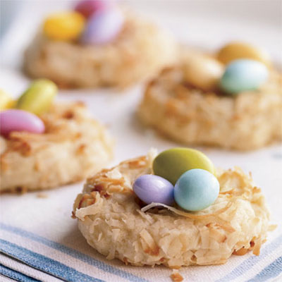 Line baking sheets with parchment paper. Mix flour, baking powder and salt in a medium bowl. Cream butter and sugar together in a large bowl with an electric mixer until smooth. Add egg, vanilla extract and coconut extract, if using, and beat until smooth. Stir in flour mixture just until incorporated. Shape dough into 1 1/4-inch balls; roll in toasted coconut. Arrange 3 inches apart on prepared baking sheets. With your thumb, make an indentation in center of each ball. Pinch sides of cookies so they stand up and form nests. Bake until golden, 10 to 12 minutes. Cool completely on baking sheets. Just before serving, place 2 or 3 chocolate eggs in each cookie.
