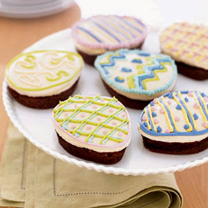 Directions: Heat oven to 350°F. Double up 24 Reynolds foil egg-shaped baking cups so you have 12 nested cups. Coat with nonstick spray. Place on a rimmed baking sheet. Make Brownies: Prepare brownie mix as directed on box for fudgy brownies. Divide batter among cups (about 3 Tbsp each). Bake 15 to 20 minutes until a toothpick inserted in centers comes out clean. Cool completely on a wire rack. Make Mousse: Heat 1⁄2 cup cream and the sugar in a medium saucepan over medium-low heat, stirring until sugar dissolves. Add chocolate; stir until melted. Scrape into a medium bowl and let cool. Beat remaining 1 cup cream with mixer on high speed until soft peaks form when beaters are lifted. Stir a large dollop into chocolate mixture, then fold in remaining. Remove 3⁄4 cup mousse. Divide among as many small bowls as colors you plan to use. Tint each a color. Spoon into small ziptop bags, press out air, then seal bags. Spoon remaining mousse on brownies (about 2 rounded Tbsp each). Spread to edge. Cut tip off 1 corner of each bag; pipe designs on eggs. Refrigerate at least 1 hour before removing foil to serve.