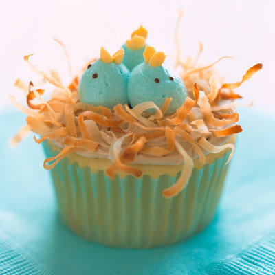 Lightly frost cupcakes with 1 cup Chocolate Buttercream; set aside. Tint 2 tablespoons reserved buttercream pale yellow; place in a pastry bag fitted with a #349 Ateco leaf tip; set aside. Tint remaining buttercream light blue; place in a pastry bag fitted with a #11 Ateco plain round tip, and pipe three bluebird heads, 3/4 inch in diameter, onto each cupcake. Using leaf tip, pipe yellow beaks. With a toothpick, add melted-chocolate eyes. Form each nest with 2 tablespoons toasted coconut.