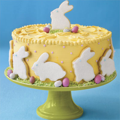 Directions: Prepare cookies: Preheat oven to 350 degrees F. Place cookie dough on a clean countertop and knead in flour until incorporated. (This will help the cookies keep their shape as they bake.) On lightly floured surface, roll out dough to a 1/4-inch thickness. Using a bunny-shaped cookie cutter, cut out as many cookies as possible; reroll trimmings and repeat. Place cookies 1 inch apart on ungreased cookie sheets. Bake 10 to 12 minutes, or until golden around edges. Cool on baking sheet 5 minutes, then remove cookies to wire rack to cool completely. Spread cooled cookies evenly with vanilla frosting. Sprinkle with white sugar crystals or sprinkles, if desired. If you want to give bunnies eyes and noses, tint a small amount of remaining frosting blue and pink with food coloring; transfer to zip-top bags, snip off corners and pipe frosting onto cookies. (You can use store-bought gel decorator icing instead.) If preparing cookies in advance, let frosting dry completely before storing cookies in an airtight container. Cover and refrigerate any remaining frosting (both plain and tinted) to use on cake. Prepare cake as package directs for an 8-inch, 2-layer cake. Cool layers completely as directed. Wrap layers separately in plastic wrap and chill until ready to assemble. Empty tub of vanilla frosting into bowl and tint with yellow food coloring. Place 1 cake layer on a serving platter. Top with about 1/3 cup frosting. Cover with second cake layer; spread about 2/3 cup frosting on top (use the back of a spoon to make decorative swirls). Cover sides of cake with remaining frosting. Use any leftover frosting from cookies to pipe decorations onto cake, if desired. Carefully press about 8 to 12 bunny cookies into sides of cake and place one cookie on top. (Serve any extra cookies on the side.) Garnish cake with candy-coated chocolate eggs. To make grass, tint some flaked coconut with green food coloring; sprinkle around base of cake and on top.
