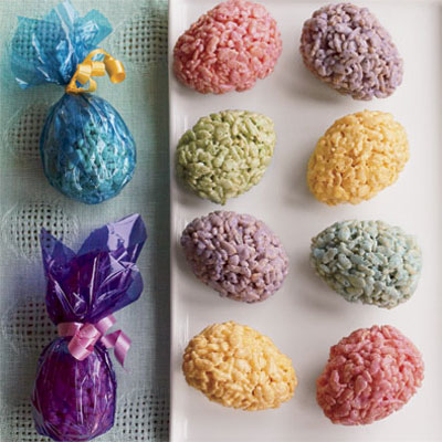 Stir in cereal until it is completely coated with marshmallow mixture. Mist hands generously with cooking spray. Shape cereal mixture into 15 to 20 ovals (work quickly while mixture is still warm and soft). If you like, press M&M’s into eggs to make stripes or polka dots. Cool completely. Wrap in cellophane or store in an airtight container.