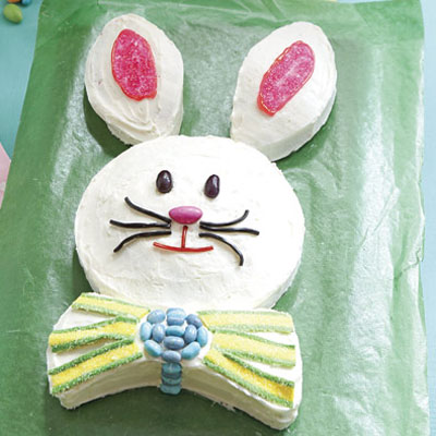 Directions: Prepare cake mix according to package directions and follow instructions to bake cake in two 8-inch round pans. Remove from pans and let cool completely. Using sharp paring knife, cut one layer into three pieces, as shown in diagram (right). Using a bit of frosting, attach both ears to the top of the round cake and the bow tie to the opposite end. Cover entire cake with frosting, using a lightly swirled pattern. Create the bunny’s face by using jelly beans for the eyes, a Jordan almond for the nose and licorice rope for the whiskers and mouth. Decorate the bow tie with jelly beans in the center and licorice strips on the sides. Adorn the ears with sprinkles or decorating sugar.