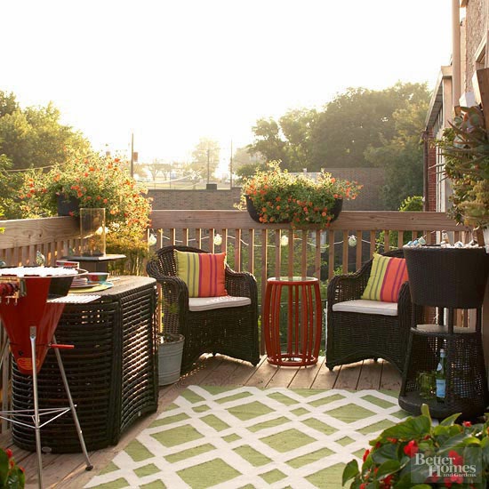 Use a colorful and patterned outdoor rug to pull your patio furnishings together. The rug will liven up pavers, brick, or wood flooring; bring your color scheme down to the ground; and create a visual center for your outdoor room.
