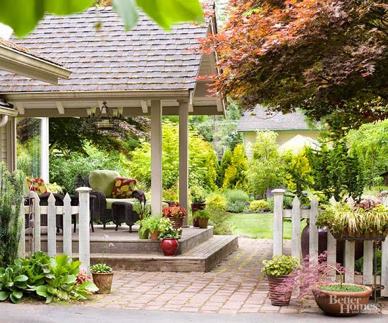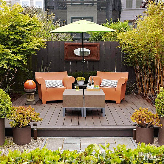Use all-weather deck material to create an elevated patio. Large containers with lush plantings placed at the corners visually connect the patio to its surroundings. Consider matching the containers to the patio material for a unified look.