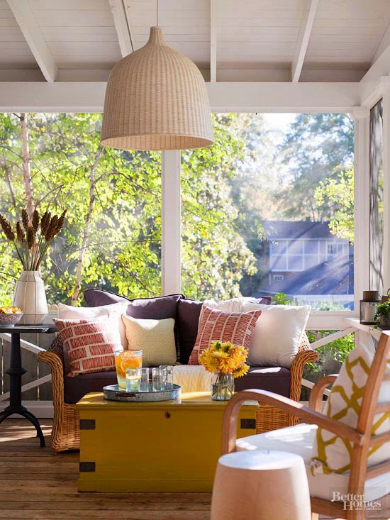 Create an ultracomfortable space by adding the same luxuries you enjoy in your living room. Furniture with plush cushions provides a great place to relax. A stylish indoor-outdoor light fixture suspended from the ceiling makes the space usable after dark.