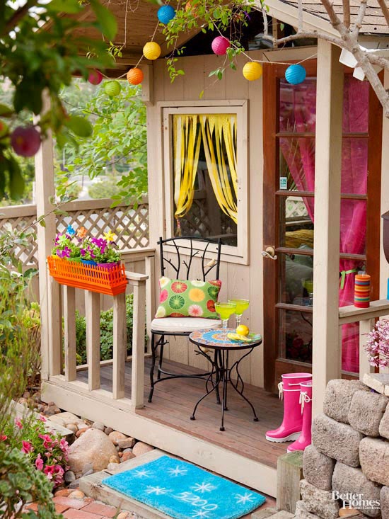 A child’s dream come true, this playhouse features a front porch complete with a bistro table and chair, a flower box, and a string of colorful lights.