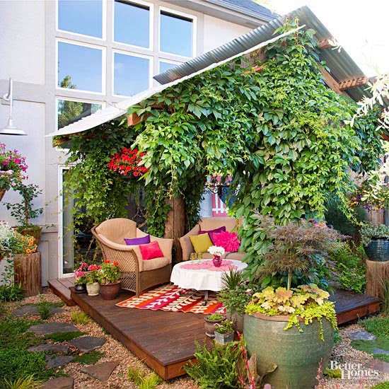 Use simple materials to create a warm and welcoming outdoor room. Here, a basic deck is dressed up with wood pillars covered in thick greenery. A corrugated-metal roof provides a modern and distinctive touch. Bright fabrics and flowers add pops of color.