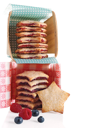 Crisp sugared tops give way to tender, buttery cookies sandwiching sweet-tart berry jam. Assembled before baking, the stars’ rich dough and fruity filling melt into each other. Yield Makes about 40 sandwich cookies