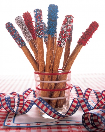 Like most sparklers, these are extinguished after a short while — with several large bites. To make two dozen, place 4 ounces chopped semisweet chocolate in a heatproof bowl set over a pan of simmering water. Stir occasionally until melted; remove from heat. Using a pastry brush, coat the upper third of each pretzel rod in chocolate. Cover with sprinkles; stand pretzels upright in a glass. Place in the refrigerator until firm, about 5 minutes.