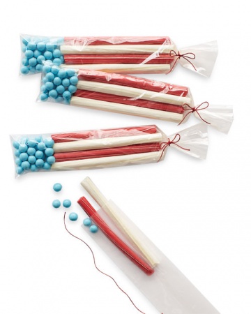 Start by partially filling a 2-by-10-inch cellophane bag with blue candies to stand in for stars. Then add red and white candy sticks to mimic stripes. Tie the bag with red waxed twine, and don’t be surprised if you catch yourself humming “Stars and Stripes Forever.”