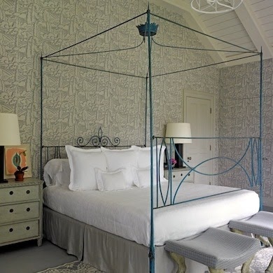 In order to keep the calm in a soft-colored room yet give it a memorable spin, interior designer Frank de Biasi had this antique Florentine bed painted a brilliant shade of cornflower blue. The color veers toward the mystical-spiritual-purple side of the spectrum while enhancing the soothing silvery and cream color scheme of the room.