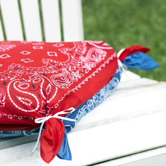 Soften outdoor chairs with no-sew pillow covers crafted from contrasting bandannas. Sandwich one cushion between two scarves, then join each corner together with a rubber band and hide bands with thin ribbon, as shown.