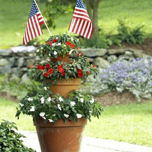 A tower of potted plants marks a tread-on-me path. Gather three pots and saucers. Fill each pot with soil; stack with saucers in between. Tuck in-palette impatiens into the soil; pop in a pair of flags.