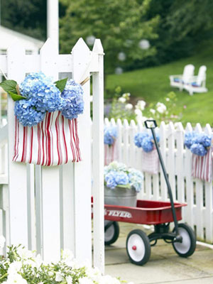 All-white flowers like hydrangeas seem instantly all-American presented in a vase that evokes the stars and stripes. Measure the vase’s circumference, then cut lengths of patriotic ribbon to size. Attach with double-sided tape to cover the vase.